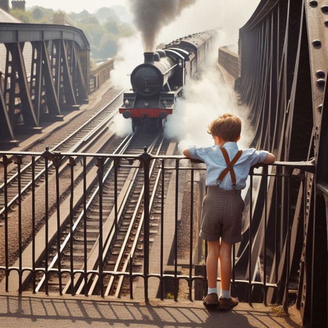 On the railway bridge the five-year-old boy ducks up and down, jumping with sheer excitement and terror. He holds fast to the iron-wrought railings seeking safety from the exposed platform below.